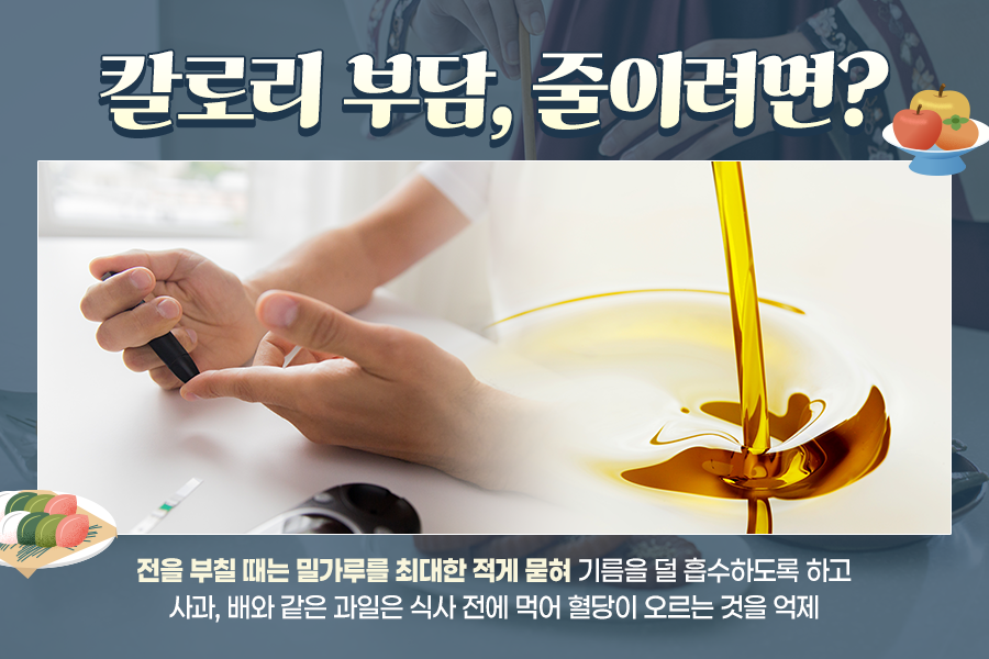 튀기고 볶는 조리 방식도 삶거나 찌는 방법으로 바꿔 칼로리를 줄일 수 있는데요. 전을 부칠 때는 밀가루를 최대한 적게 묻혀 기름을 덜 흡수하도록 합니다. 또한 에어프라이기를 사용해 기름기를 빼 조리하는 것도 하나의 방법이죠.