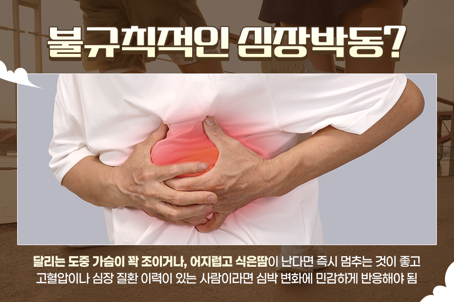 하지만 모든 심장 박동이 건강하다는 뜻은 아닙니다. 달리는 도중 맥박만 빨라지는 게 아니라 가슴이 꽉 조이거나 갑자기 어지럽고 식은땀이 난다면 즉시 달리기를 멈추는 것이 좋습니다.
