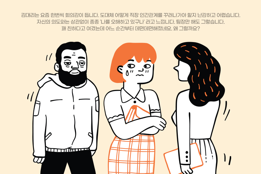 김대리는 요즘 한번씩 회의감이 듭니다. 도대체 어떻게 직장 인간관계를 꾸려나가야 할지 난감하고 어렵습니다. 자신의 의도와는 상관없이 종종 '나를 오해하고 있구나' 라고 느낍니다. 팀장만 해도 그렇습니다. 꽤 친하다고 여겼는데 어느 순간부터 데면데면해졌네요. 왜 그럴까요?