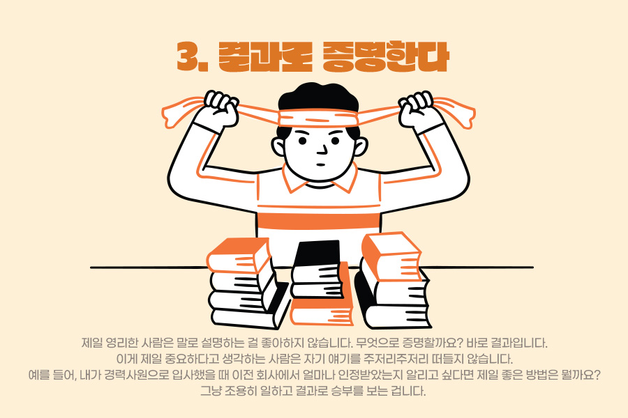 제일 영리한 사람은 말로 설명하는 걸 좋아하지 않습니다. 무엇으로 증명할까요? 바로 결과입니다. 이게 제일 중요하다고 생각하는 사람은 자기 얘기를 주저리주저리 떠들지 않습니다. 예를 들어, 내가 경력사원으로 입사했을 때 이전 회사에서 얼마나 인정받았는지 알리고 싶다면 제일 좋은 방법은 뭘까요? 그냥 조용히 일하고 결과로 승부를 보는 겁니다. 자기가 아무리 말로 어필해도 별 의미없어요. 결과가 없으면 오히려 말이 많았던 것이 더 문제 될 수 있습니다.