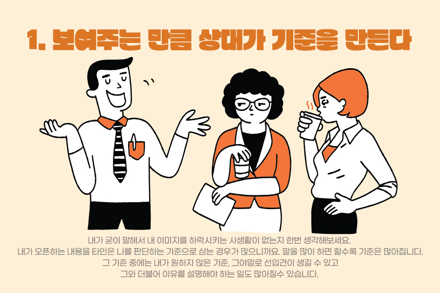 내가 굳이 말해서 내 이미지를 하락시키는 사생활이 없는지 한번 생각해보세요. 내가 오픈하는 내용을 타인은 나를 판단하는 기준으로 삼는 경우가 많으니까요. 말을 많이 하면 할수록 기준은 많아집니다. 그 기준 중에는 내가 원하지 않은 기준, 그야말로 선입견이 생길 수 있고 그와 더불어 이유를 설명해야 하는 일도 많아질수 있습니다. 설명이 길어지면 어떻게 될까요? 신뢰가 점점 줄어드는 거죠. 무서운 일입니다.