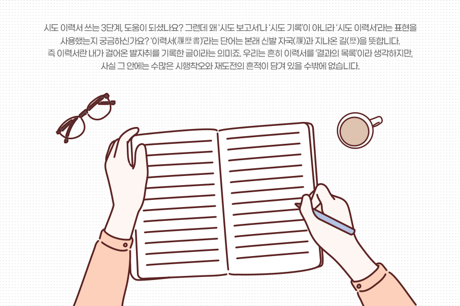시도 이력서 쓰는 3단계, 도움이 되셨나요? 그런데 왜 ‘시도 보고서’나 ‘시도 기록’이 아니라 ‘시도 이력서’라는 표현을 사용했는지 궁금하신가요? ‘이력서(履歷書)’라는 단어는 본래 신발 자국(履)과 지나온 길(歷)을 뜻합니다. 즉 이력서란 내가 걸어온 발자취를 기록한 글이라는 의미죠. 우리는 흔히 이력서를 ‘결과의 목록’이라 생각하지만, 사실 그 안에는 수많은 시행착오와 재도전의 흔적이 담겨 있을 수밖에 없습니다.