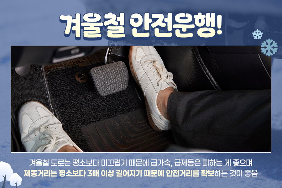 겨울철 눈길, 빙판길은 일반 도로보다 더 미끄럽기 때문에 윈터 타이어를 사용하더라도 안전 운전이 가장 중요한데요. 급가속, 급제동은 차가 쉽게 미끄러질 수 있어 자제하는 것이 좋습니다.