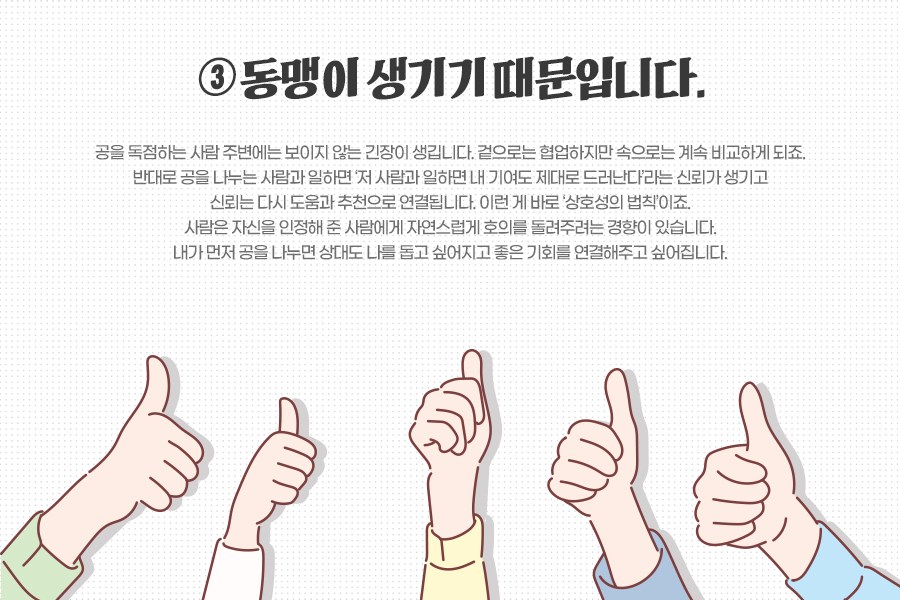 공을 독점하는 사람 주변에는 보이지 않는 긴장이 생깁니다. 겉으로는 협업하지만 속으로는 계속 비교하게 되죠. 반대로 공을 나누는 사람과 일하면 ‘저 사람과 일하면 내 기여도 제대로 드러난다’라는 신뢰가 생기고 신뢰는 다시 도움과 추천으로 연결됩니다. 이런 게 바로 ‘상호성의 법칙’이죠. 사람은 자신을 인정해 준 사람에게 자연스럽게 호의를 돌려주려는 경향이 있습니다. 내가 먼저 공을 나누면 상대도 나를 돕고 싶어지고 좋은 기회를 연결해주고 싶어집니다.