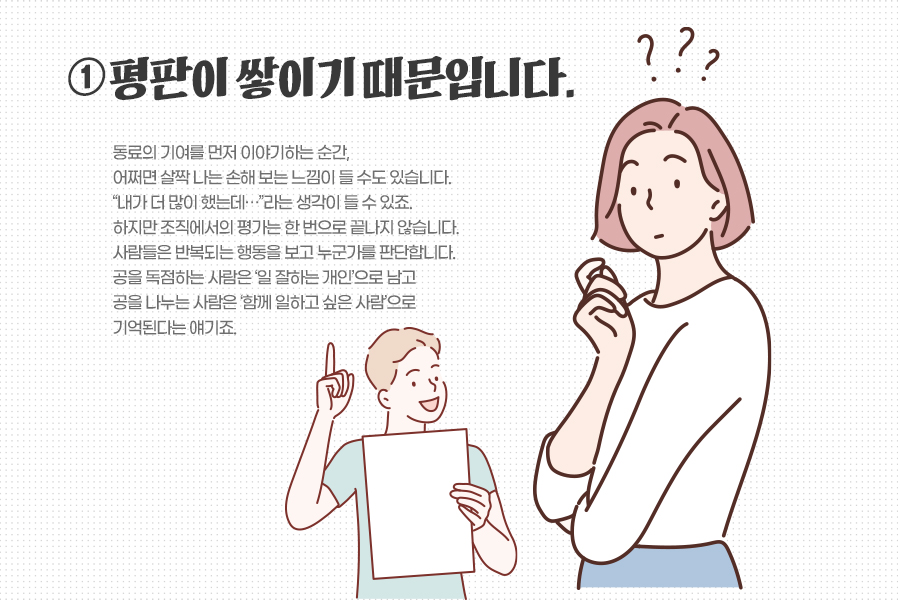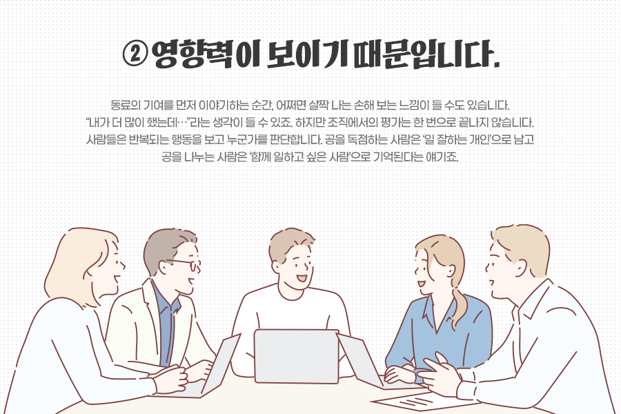 동료의 기여를 먼저 이야기하는 순간, 어쩌면 살짝 나는 손해 보는 느낌이 들 수도 있습니다. “내가 더 많이 했는데…”라는 생각이 들 수 있죠. 하지만 조직에서의 평가는 한 번으로 끝나지 않습니다. 사람들은 반복되는 행동을 보고 누군가를 판단합니다. 공을 독점하는 사람은 ‘일 잘하는 개인’으로 남고 공을 나누는 사람은 ‘함께 일하고 싶은 사람’으로 기억된다는 얘기죠. 자연스레 중요한 기회는 후자에게로 가게 될 겁니다.