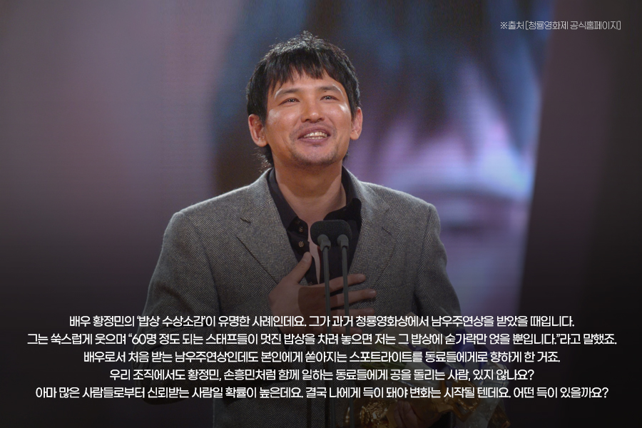 하지만 그런 본능을 이겨내고 동료를 더 적극적으로 내세우는 사람들이 있습니다. 배우 황정민의 ‘밥상 수상소감’이 유명한 사례인데요. 그가 과거 청룡영화상에서 남우주연상을 받았을 때입니다. 그는 쑥스럽게 웃으며 “60명 정도 되는 스태프들이 멋진 밥상을 차려 놓으면 저는 그 밥상에 숟가락만 얹을 뿐입니다.”라고 말했죠. 배우로서 처음 받는 남우주연상인데도 본인에게 쏟아지는 스포트라이트를 동료들에게로 향하게 한 거죠. 축구선수 손흥민도 비슷합니다. 경기에서 맹활약을 펼친 후 이어지는 인터뷰에서 그는 매번 “동료들이 잘해준 덕분”이라고 말하죠.