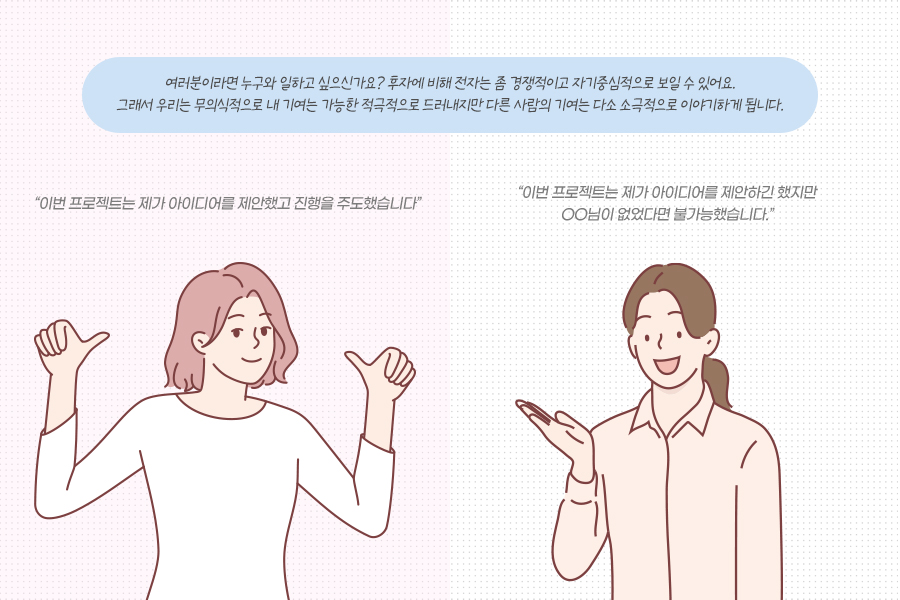 “이번 프로젝트는 제가 아이디어를 제안했고 진행을 주도했습니다” VS “이번 프로젝트는 제가 아이디어를 제안하긴 했지만 OO님이 없었다면 불가능했습니다. OO님이 현실적인 디테일을 잘 살려 주셔서 진행이 원활했습니다”