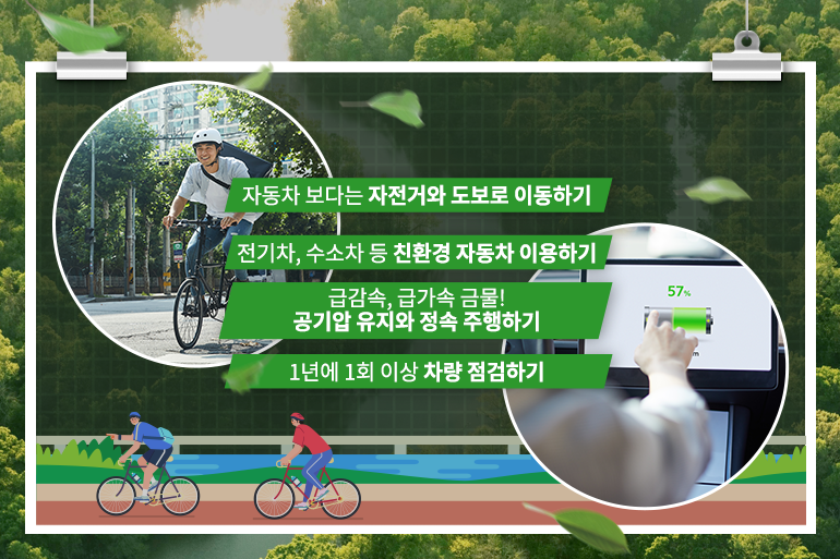 자동차를 운전할 때는 타이어 공기압을 적절히 유지하고, 정속 주행을 하면서 급가속과 급감속을 피한다면 연비를 15% 줄이는 동시에 탄소 절감 효과까지 볼 수 있습니다. 낡은 점화플러그나 더러워진 공기필터 등은 연료 소비를 높여 연비를 떨어뜨리는 원인이 될 수 있으니 1년에 1회 이상 차량 점검하는 것도 잊지 말아야겠죠?