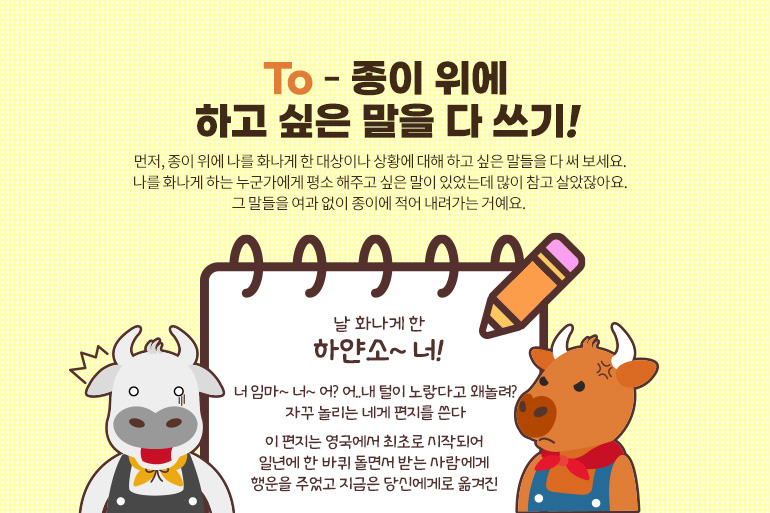 TO. 먼저, 종이 위에 나를 화나게 한 대상이나 상황에 대해 하고 싶은 말들을 다 써 보세요. 나를 화나게 하는 누군가에게 평소 해주고 싶은 말이 있었는데 많이 참고 살았잖아요. 그 말들을 여과 없이 종이에 적어 내려가는 거예요. 거친 말이 나오면 나오는대로 그대로 투박하게 써도 됩니다. 누구에게 보여 줄 건 아니니까요. 시원하게 마음에 있는 말을 다 썼다면 그 다음에는 이런 행동을 합니다. 종이를 구겨서 쓰레기통에 넣는 것이예요. 종이를 버리면서 이렇게 외칩니다. “넌 내 마음에 들어올 권리 없어. 잘가!” 이 행동 하나 만으로도 가지고 있던 부정적인 감정이 사라지는 것을 느낄 수 있을 거예요.