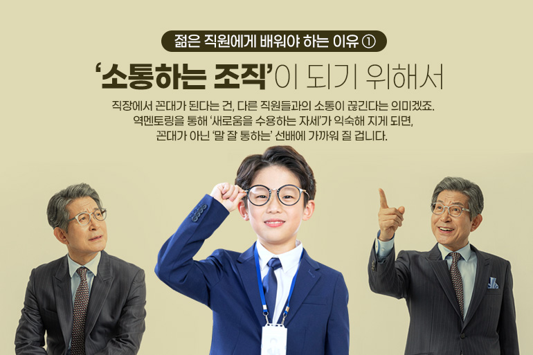 먼저, ‘소통하는 조직’이 되기 위해서 입니다. 소위 ‘꼰대’란 본인과 다른 사고방식을 타인에게 강요하거나, 타인의 사고 방식을 인정하지 않고 자신의 생각이 옳다고 주장하는 사람을 말합니다. 직장에서 꼰대가 된다는 건, 다른 직원들과의 소통이 끊긴다는 의미겠죠. 소통이 안 되는 조직에서 성과가 날 리 없고요. 역멘토링을 통해 ‘새로움을 수용하는 자세’가 익숙해 지게 되면, 꼰대가 아닌 ‘말 잘 통하는’ 선배에 가까워 질 겁니다.
