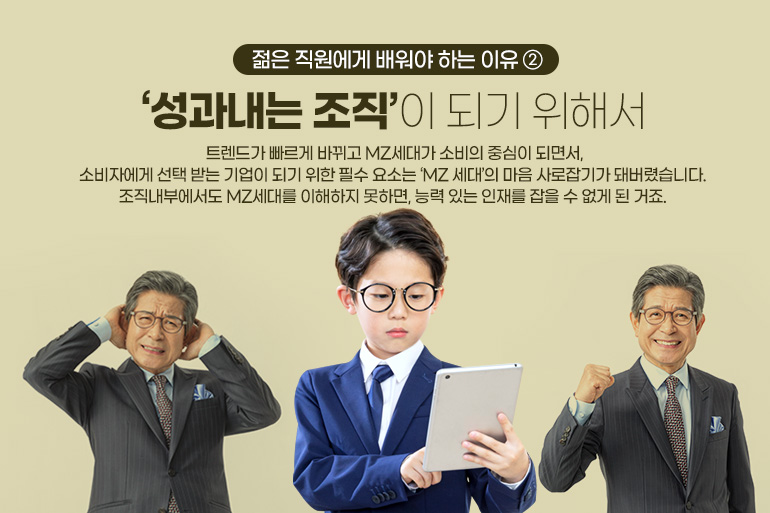 둘째는 ‘성과 내는 조직’이 되기 위해서 입니다. 트렌드가 빠르게 바뀌고 MZ세대가 소비의 중심이 되면서, 소비자에게 선택 받는 기업이 되기 위한 필수 요소는 ‘MZ 세대’의 마음 사로잡기가 돼버렸습니다. 조직 내부에서도 마찬가지입니다. MZ세대가 직원의 3-40%를 차지 하면서 이들을 이해하지 못하면, 능력 있는 인재를 잡을 수 없게 된 거죠.
