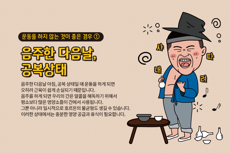 운동을 하지 않는 것이 오히려 도움이 되는 첫 번째는 음주한 다음날 아침, 공복 상태일 경우입니다. 이러한 상태에서는 운동을 하지 말아야 하는데요. 그 이유는 이때 운동을 하게 되면 오히려 근육이 쉽게 손실되기 때문입니다. 음주를 하게 되면 우리의 간은 많은 일을 해야 하죠. 알콜을 해독하기 위해서 평소보다 많은 영양소들이 간에서 사용됩니다. 그뿐 아니라 일시적으로 호르몬의 불균형도 생길 수 있습니다. 이러한 상태에서는 충분한 영양 공급과 휴식이 필요합니다. 많은 일을 한 간을 쉬게 해주고 영양소 보충을 통해서 다시 회복 시켜야 하죠.