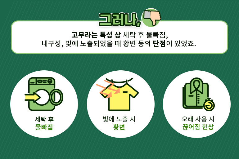 하지만 기존 스판덱스의 경우 고무라는 특성상 폴리에스터와 재직이 쉽지 않고 염색이 잘 구현되지 않아 세탁 후 물 빠짐, 내구성, 빛에 노출되었을 때 황변 등의 단점이 있습니다. 또한 오래 사용을 할 경우 스판이 뚝뚝 끊어지는 현상이 나타날 수 있죠. 이러한 단점을 가진 스판덱스를 대체할 수 있는 섬유는 없을까요?