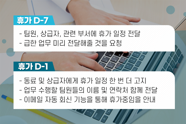 휴가 기간동안 원활하게 업무가 진행되어야 휴가를 떠난 당사자도 마음 편히 휴식을 즐길 수 있을 텐데요. 이를 위해서는 꼼꼼한 업무 인수인계가 필수죠. 업무는 한 사람에게 몰아주기보다는 여러 팀원들에게 나누어 주어야 부담을 덜 수 있어요. 공동으로 진행하던 업무는 인계하기가 쉽지만 혼자 진행하던 업무라면 같은 업무 경험이 있거나 비슷한 업무를 수행하는 동료에게 부탁하는 것이 좋겠죠.