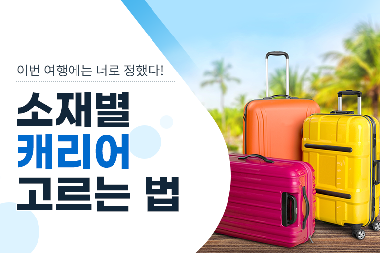 생각만으로도 우리를 설레게 하는 단어가 있다면 그건 바로 ‘여행’이 아닐까 싶은데요. 편안한 여행을 위해 절대 빠질 수 없는 것이 바로 여행용 캐리어입니다. 캐리어는 여행 내내 우리와 한 몸처럼 다니는 파트너이기 때문에 여행 기간, 여행 스타일, 교통수단 등 다양한 점을 고려해 선택하는 것이 중요해요. 그렇다면 본격적인 여행 준비 전, 캐리어의 소재별 특징을 살펴보고 이번 여행에 맞는 캐리어를 한 번 찾아볼까요?