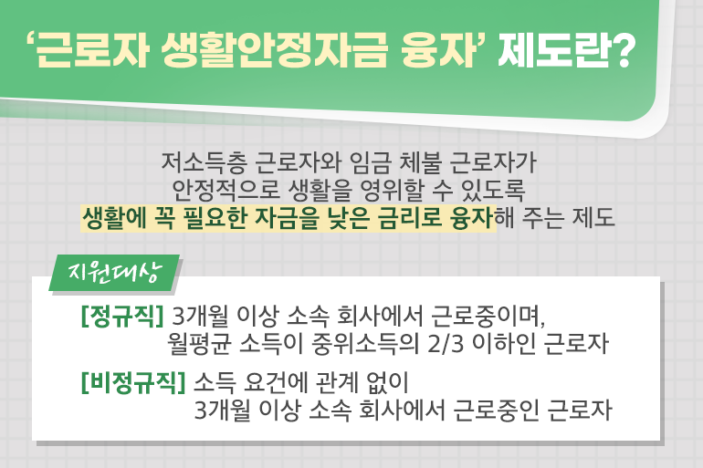 ‘근로자 생활안정자금 융자’는 저소득층 근로자와 임금 체불 근로자가 안정적으로 생활을 영위할 수 있도록 생활에 꼭 필요한 자금을 낮은 금리로 융자해 주는 제도예요. 정규직일 경우 3개월 이상 소속 회사에서 근로 중이고, 월평균 소득이 중위소득의 2/3 이하인 근로자라면 혜택을 받을 수 있어요. 비정규직일 경우엔 소득 요건에 관계없이 3개월 이상 근로 중인 근로자라면 ‘근로자 생활안정자금’ 수혜 대상이 될 수 있죠.