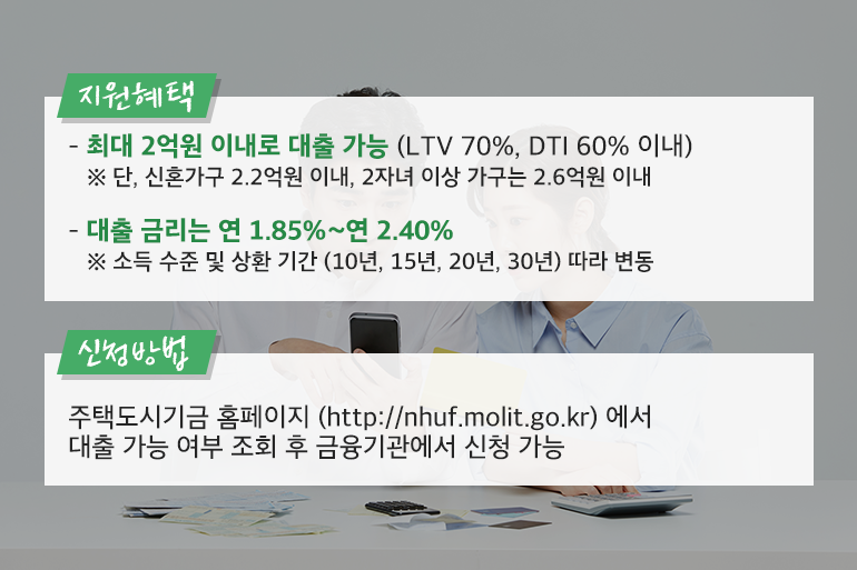 가장 많은 직장인들이 꼽는 목표 1위가 바로 ‘내 집 마련’이라고 해요. 하지만 아무리 열심히 월급을 모으고, 돈을 아껴도 집 한 채 마련하는 것이 쉽지가 않은데요. 그렇다고 무작정 비싼 금리로 대출을 받기에는 앞으로 갚아 나갈 일이 걱정이죠. ‘내 집 마련 디딤돌 대출 지원’은 대출이자율을 낮춰 주택 자금 대출 부담을 줄여주는 지원 사업이에요.