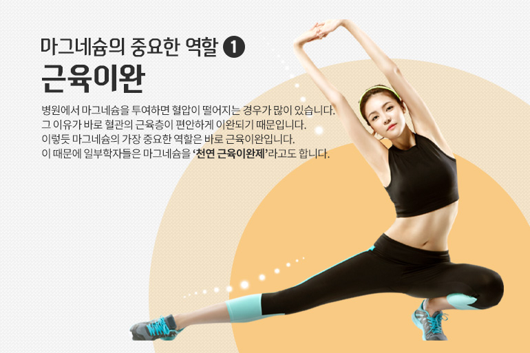 근육은 우리의 신체 내 장기에도 분포되어 있는데, 특히 가장 중요한 혈관의 벽에도 근육층이 있습니다. 그래서 마그네슘이 부족해지면 혈관의 근육층도 수축하게 되고, 혈관이 좁아져 혈압이 올라가게 됩니다. 실제로 병원에서 마그네슘을 투여하면 혈압이 떨어지는 경우가 많이 있습니다. 그 이유가 바로 혈관의 근육층이 편안하게 이완되기 때문입니다. 이렇듯 마그네슘의 가장 중요한 역할은 바로 근육이완입니다. 이 때문에 일부학자들은 마그네슘을 ‘천연 근육이완제’라고도 합니다.