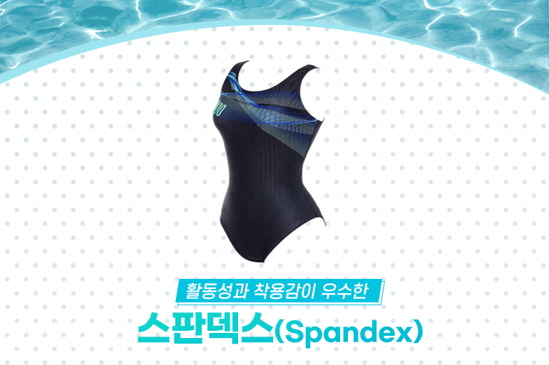 흔히 ‘스판’이라고 불리는 ‘스판덱스(Spandex)’는 수영복에서 가장 흔하게 사용하는 소재예요. 전문용어로는 ‘폴리우레탄 탄성 섬유’라고 불리며, 고무와 비슷한 특성을 갖지만 고무줄보다 가볍고 튼튼하며 신축성이 뛰어난 것이 특징이죠. 탁월한 신축성 덕분에 활동성이 높아 수영복 외에도 속옷, 등산복, 요가복, 신발 등에 다양하게 사용되고 있어요.