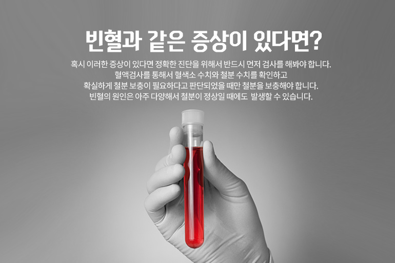 혹시 이러한 증상이 있다면 정확한 진단을 위해서 반드시 먼저 검사를 해봐야 합니다. 혈액검사를 통해서 혈색소 수치와 철분 수치를 확인하고 확실하게 철분 보충이 필요하다고 판단되었을 때만 철분을 보충해야 합니다. 빈혈으로 진단 되었다고 해서 모두 철분이 부족한 것은 아닙니다. 빈혈이라는 것은 혈액검사에서 혈색소가 부족한 상태를 말하는 것으로 그 원인은 아주 다양해서 철분이 정상일 때에도 빈혈이 발생할 수 있죠.