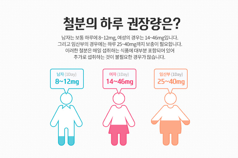 그렇다면 철분의 하루 권장량은 얼마나 될까요? 남자는 보통 하루에 8~12mg, 여성의 경우는 14~46mg입니다. 그리고 임산부의 경우에는 하루 25~40mg까지 보충이 필요합니다. 이러한 철분은 매일 섭취하는 식품에 대부분 포함되어 있어 추가로 섭취하는 것이 불필요한 경우가 많습니다.