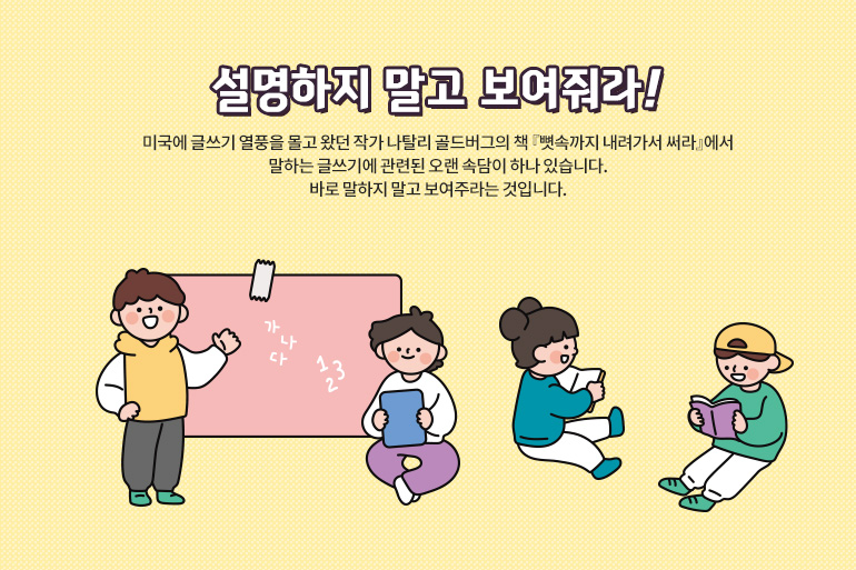 글을 쓸 때 사건 위주로 생생하게 현장의 이야기를 전달하듯 쓰면 되겠네요. 절대 자신이 느낀 감정을 설명하면서 독자에게 그 감정을 느끼라고 강요하지 말고, 그냥 보여주세요. 이때는 좀 세밀하게 글을 써도 됩니다. 내가 겪었던 사건, 이야기는 누구나 할 수 있을 거예요. 글을 쓰는 사람은 스토리를 보여주기만 하면 되고, 깨닫는 건 독자에게 맡겨 주세요. 어떤 상황에 대해 설명하지 않고, 상황을 통한 스토리텔링으로 상상하게 만드는 것이 잘 읽히는 글쓰기의 첫 번째 비법입니다.
