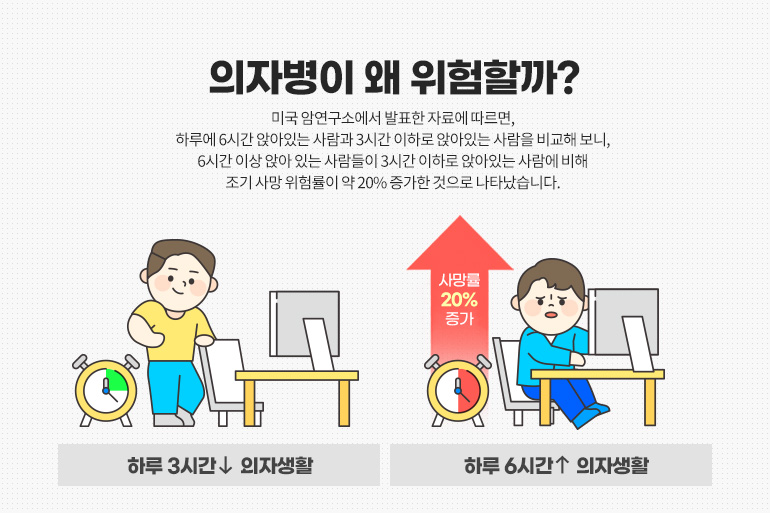 도대체 어떤 연구결과가 있길래 의자병이 이토록 위험한 병이라고 하는 것일까요? 미국 암연구소에서 발표한 자료에 따르면, 하루에 6시간 앉아있는 사람과 3시간 이하로 앉아있는 사람을 비교해 보니, 6시간 이상 앉아 있는 사람들이 3시간 이하로 앉아있는 사람에 비해 조기 사망 위험률이 약 20% 증가한 것으로 나타났습니다.