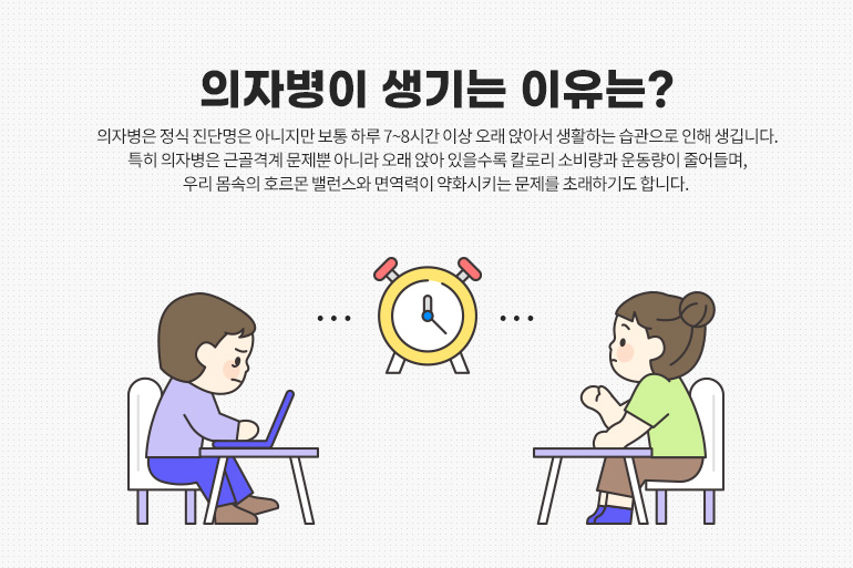의자병은 정식 진단명은 아니지만 보통 하루 7~8시간 이상 오래 앉아서 생활하는 습관으로 인해 생깁니다. 특히 의자병은 근골격계 문제뿐 아니라 오래 앉아 있을수록 칼로리 소비량과 운동량이 줄어들며, 우리 몸속의 호르몬 밸런스와 면역력이 약화시키는 문제를 초래하기도 합니다.