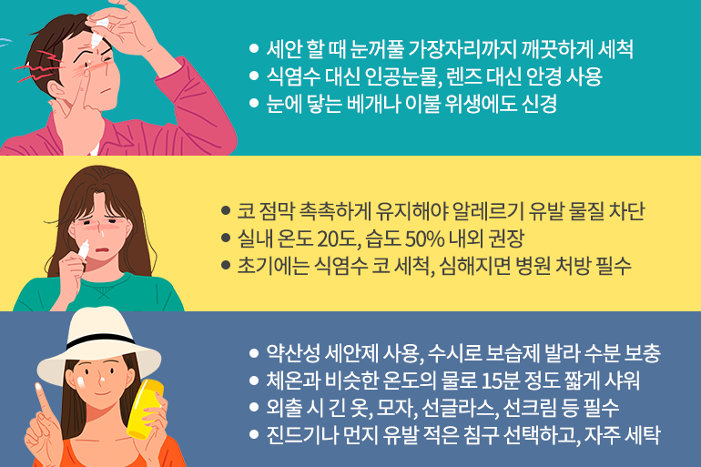 알레르기성 질환을 예방하기 위해서는 주위 환경과 몸을 청결하고, 위생적으로 유지하는 것이 무무엇보다 중요한데요. 특히 알레르기성 결막염을 예방하기 위해서는 세안을 할 때 눈꺼풀 가장자리까지 깨끗하게 닦아내는 습관을 들여야 해요. 또한 야외에서 눈이 가렵거나 이물감이 느껴진다면 식염수 대신 인공눈물을 사용해야 눈물에 있는 항균 물질, 영양 물질을 보호하면서 가려움증을 완화할 수 있답니다. 외출 시에는 렌즈 대신 안경이나 선글라스 등을 착용해 눈을 보호하고, 눈이 가까이 닿는 베개나 이불의 위생에도 각별히 신경을 쓰는 것이 중요하죠.