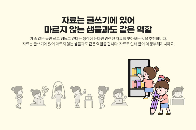 환경은 설정했는데 도무지 어떤 글을 써야 할지 모르겠다는 분도 있습니다. 그때는 떠오르는 대로 아무 글이나 써도 좋습니다. 그다음에 ‘쓸 거리’가 생각날 거예요. 또, 시간과 장소를 정해놓고 글쓰기는 하는데 계속 같은 글만 쓰고 맴돌고 있다는 생각이 든다면 관련된 자료를 찾아보는 것을 추천합니다. 자료는 글쓰기에 있어 마르지 않는 샘물과도 같은 역할을 합니다. 쓰려고 하는 주제에 관련된 자료가 많으면 많을수록 방향을 잃지 않고 글을 더 신나게 쓸 수 있고, 자료로 인해 글이 더 풍부해지니까요.