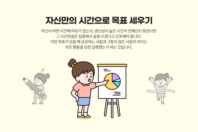 자신이 어떤 시간에 여유가 있는지, 생산성이 높은 시간이 언제인지 찾았다면 그 시간만큼은 집중해서 글을 쓰겠다고 선포해야 합니다. 시간을 정해놓고 운동을 하듯 말이죠. 어떤 목표가 있을 때 성공하는 사람과 그렇지 않은 사람의 차이는 작은 행동을 당장 실행했는가 하는 것입니다. 언젠가 써야지가 아닌 ‘몇 시부터 몇 시까지 어떤 공간에서 글을 쓰겠다.’라는 구체적인 글을 적어놓고, 그 시간만큼은 방해 요소를 차단하고 집중해 보시기 바랍니다. 10분, 30분의 짧은 시간이라도 괜찮습니다. 타이머를 맞추어 놓고 쓰면 집중도를 높일 수 있습니다. 매일 과정을 반복하다 보면 빈 종이가 어느새 채워져 가는 게 보이면서 할 수 있다는 자신감이 생길 것입니다.