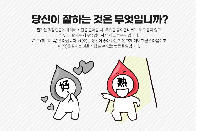 필자는 직장인들에게 미래 비전을 물어볼 때 “무엇을 좋아합니까?” 라고 묻지 않고 “당신이 잘하는 게 무엇입니까? ” 라고 묻는 편입니다. '好(호)'와 '熟(숙)'은 다릅니다. 好(호)는 당신이 좋아 하는 것은 그저 해보고 싶은 마음이고, 熟(숙)은 잘하는 것을 직접 할 수 있는 행동을 말합니다. 한 진로상담 전문가는 “상담을 하다보면 잘하는 것과 좋아하는 것을 혼돈하는 사람이 많다. 좋아하는 것을 직업으로 삼을 경우 재능을 발휘하지 못하는 실수를 범하기 쉽다.”고 역설했습니다. 많은 사람들이 좋아하는 것을 직업으로 하면 ‘평균’ 되기 때문이죠. 그래서 필자는 잘 하는 것을 더욱더 잘 하라고 말합니다.