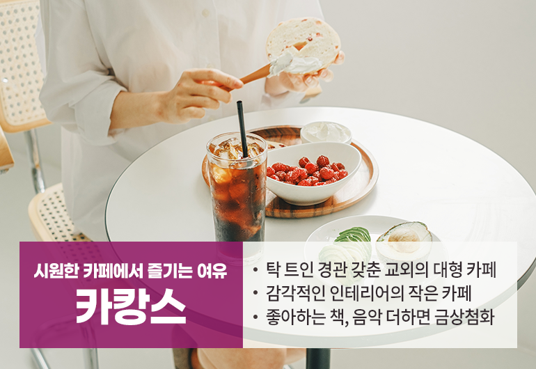시원한 카페에서 달달한 디저트와 음료를 마시며 휴가를 보내는 ‘카캉스’도 추천할만한데요. 교외로 나가면 탁 트인 경관을 갖춘 대형 카페들이 많아 여유를 즐기기 좋아요. 반대로 아기자기한 소품과 감각적인 인테리어를 갖춘 자그마한 카페들을 찾아다니며 혼자만의 시간을 갖는 것도 좋은 추억이 될 수 있죠. 읽고 싶었던 책, 좋아하는 음악과 함께 카캉스를 즐긴다면 더 완벽한 여름휴가를 보낼 수 있을 거예요.