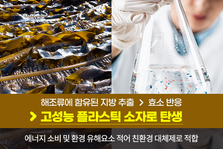 이렇게 처치곤란 상태였던 해조류 부산물을 국내 연구진들이 고성능 플라스틱 소재로 재탄생시켜 화제를 모았는데요. 건조한 해조류에 함유된 지방을 미생물 반응을 통해 추출한 후, 젖산균 등에서 얻을 수 있는 효소반응을 통해 고성능 플라스틱 소자로 만들게 된 것이죠. 에너지 소비와 환경 유해요소가 적어 친환경 플라스틱 대체제로 특히 적합해요.
