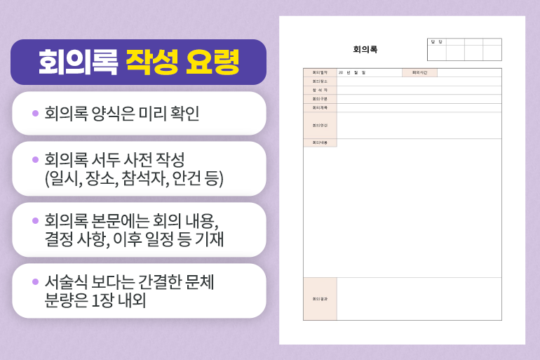 의견을 공유하고, 중요한 의사를 결정하는 회의는 직장인들의 회사 생활에서 큰 비중을 차지하는데요. 각자의 소중한 업무 시간을 할애해 참석하는 만큼 조금 더 꼼꼼하게 회의를 준비하고, 적극적인 태도로 임한다면 조금 더 의미 있는 시간이 될 수 있을 거예요.