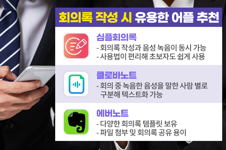 회의록 작성이 번거롭고, 복잡하게 느껴진다면 어플을 사용하는 것도 좋은 방법인데요. ‘심플회의록’은 회의록 작성과 음성 녹음이 동시에 가능하며, 사용법이 편리해 회의록 작성 경험이 적어도 누구나 쉽게 사용할 수 있죠. ’클로바노트’는 회의 중 녹음한 음성을 말한 사람 별로 구분해 텍스트로 작성해주어 유용해요. ‘에버노트’는 다양한 회의록 템플릿을 활용할 수 있고, 파일 및 이미지 첨부는 공유까지 용이해 활용도가 높아요. 다만 유료 어플이라는 아쉬움이 있답니다.