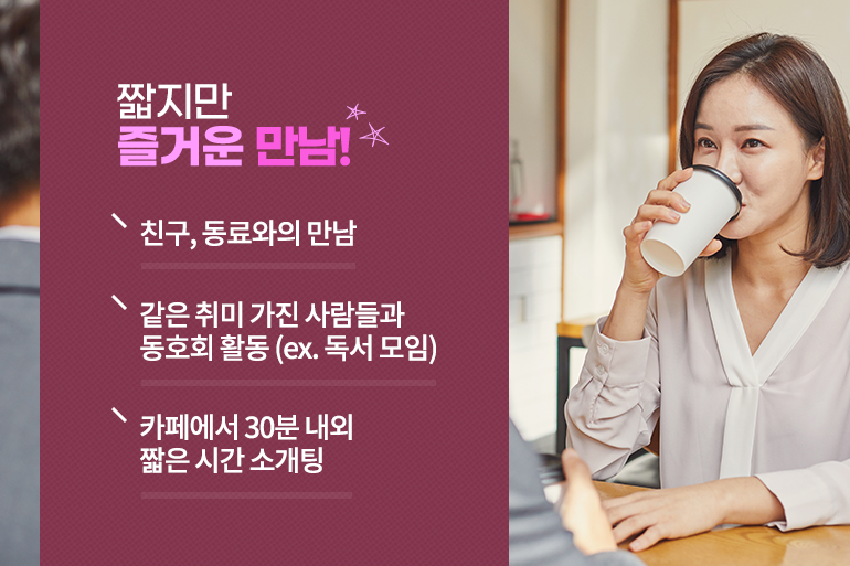 최근에는 점심 시간 소개팅이 유행하고 있는데요. 상대가 마음에 들지 않아도 비싼 밥을 먹고, 많은 시간을 할애하는 기존의 소개팅 방식에서 벗어나 카페에서 10~30분 정도 짧은 만남을 갖는 거예요. 짧은 만남으로도 서로에 대한 호감은 충분히 확인할 수 있으니 상대가 마음에 들면 애프터를 결정하는 거죠. 덕분에 회사 근처 분위기 좋은 카페들은 문전성시를 이룬다고 하네요!