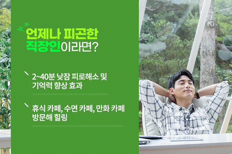 약 35%의 직장인들은 에너지 충전을 위해 휴식을 취하거나 짧은 낮잠을 잔다고 응답했는데요. 2~40분 정도의 적당한 낮잠은 피로 해소와 기억력 향상 효과도 있다고 하니 업무 효율을 높이는 데 큰 도움이 되죠. 휴식과 낮잠에 진심인 직장인들은 회사 근처 수면 카페, 휴식 카페, 만화 카페 등을 찾아 혼자만의 힐링 시간을 갖기도 한답니다.