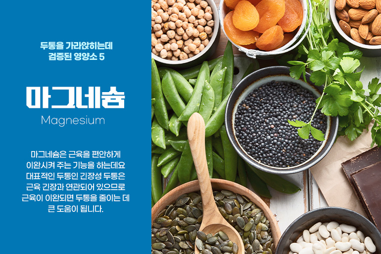 두통을 줄여주는 첫 번째 영양소는 '마그네슘'입니다. 마그네슘은 근육을 편안하게 이완시켜 주는 기능을 하는데요. 대표적인 두통인 긴장성 두통은 근육 긴장과 연관되어 있으므로 근육이 이완되면 두통을 줄이는 데 큰 도움이 됩니다. 또한 근육은 우리 어깨나 목에만 있는 것이 아니고 혈관벽에도 있기 때문에 혈관의 근육이 이완되면 여러가지 혈관성 두통을 완화시켜 주기도 합니다. 한 연구결과에 따르면 편두통 환자의 30~50%가 마그네슘 부족과 관련되어 있으며, 편두통환자에게 마그네슘을 8주간 투여한 결과 편두통 예방에 효과적이었다고 합니다.
