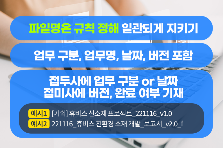 파일명을 붙일 때도 네이밍 규칙을 정해 일관되게 이를 지키는 것이 중요해요. 업무 구분, 업무명, 날짜, 버전 등을 파일명에 포함시키는 일반적인데요. [보고], [기획], [발표] 등 업무 구분이나 날짜를 접두사에 넣고, 접미사에는 히스토리를 파악할 수 있게 v1.0, v1.1 등으로 버전을 기록하죠. 최종 버전을 헷갈리지 않으려면 Final을 의미하는 ‘f’, ‘fin’을 접미사에 쓰는 것도 좋은 방법이랍니다. (파일명 예시. ‘[기획] 휴비스 신소재 프로젝트_221116_v1.0’ / 221116_휴비스 친환경 소재 개발_보고서_v2.0_f)