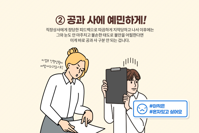 직장상사에게 정당한 피드백으로 따끔하게 지적당하고 나서 이후에는 그와 눈도 안 마주치고 불손한 태도로 불만을 어필한다면 이게 바로 공과 사 구분 안 되는 겁니다. 또한 자신의 실수를 웃음이나 눈물로 넘기려는 태도 역시 아마추어의 전형이라고 할 수 있습니다.