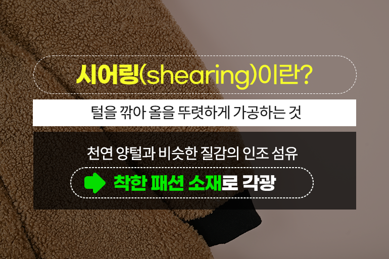 에코퍼의 볼륨감과 부피감이 조금은 부담스럽다면 ‘시어링’ 소재가 좋은 대안이 될 수 있어요. ‘시어링’은 털을 깎아 올을 뚜렷하게 가공한다는 뜻으로, 양털의 길이를 일정하게 깎는 공정을 거치는 것을 의미해요. 테디베어 코트, 무스탕 등 겨울 아우터에 주로 활용되고 있죠. 하지만 최근에는 천연 양털이 아닌 양털과 비슷하게 질감을 살린 인조 섬유를 주로 사용하는데요. 인조 섬유를 사용해도 보온성이나 복슬복슬한 질감이 잘 표현되어 착한 패션 아이템으로 인기가 높답니다.