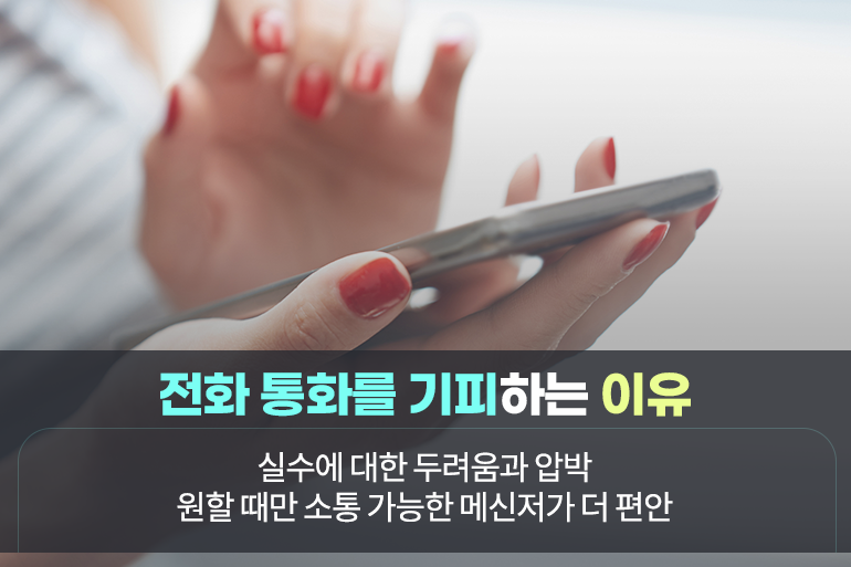 실제 콜 포비아를 경험한 이들에게 ‘전화 통화를 기피하는 이유’를 물어본 결과, 자신의 생각을 제대로 표현하지 못하거나 실수를 할 것이라는 두려움이 매우 크다고 해요. 또한 전화와 달리 메신저는 자신이 원할 때만 소통을 이어갈 수 있어 비대면 소통을 더 편하게 느낀답니다.