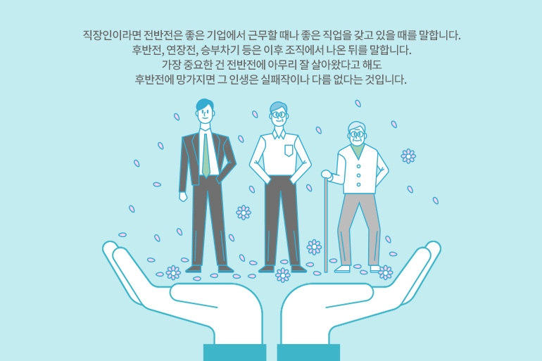 인생은 생각만 바꾼다면 이모작이 아니라 그 이상도 할 수 있습니다. 정확히 말하면 남들이 다하는 이모작이 아닌, 자신만의 '인생 이모작'을 할 수 있다는 뜻입니다. 이모작은 마치 축구의 전반전, 후반전, 연장전, 승부차기 등과 같습니다. 직장인이라면 전반전은 좋은 기업에서 근무할 때나 좋은 직업을 갖고 있을 때를 말합니다. 후반전, 연장전, 승부차기 등은 이후 조직에서 나온 뒤를 말합니다. 가장 중요한 건 전반전에 아무리 잘 살아왔다고 해도 후반전에 망가지면 그 인생은 실패작이나 다름 없다는 것입니다.