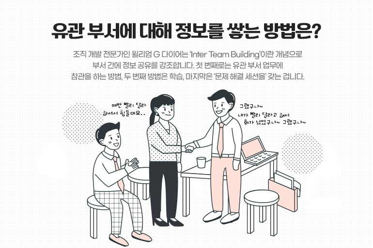 조직 개발 전문가인 윌리엄 G 다이어는 ‘Inter Team Building’이란 개념으로 부서 간에 정보 공유를 강조합니다. 첫 번째로는 유관 부서 업무에 참관을 하는 방법이 있습니다. 실제로 해외 유명기업들은 이런 방법을 통해 유관 부서의 업무 방식 등에 대한 이해를 넓힙니다. 두 번째 방법은 학습입니다. 유관 부서에게 우리 부서의 업무에 대해 교육하는 방식이죠.