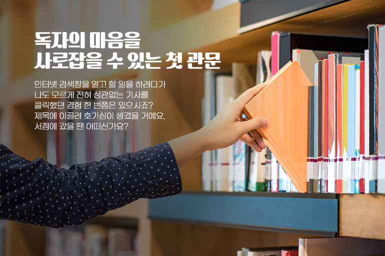 인터넷 검색창을 열고 할 일을 하려다가 나도 모르게 전혀 상관없는 기사를 클릭했던 경험 한 번쯤은 있으시죠? 제목에 이끌려 호기심이 생겼을 거예요. 서점에 갔을 땐 어떠신가요? 수많은 책 가운데 유독 내 눈을 사로잡는 책이 있지 않나요? 그건 무엇 때문일까요? 바로 표지와 제목 때문일 거예요. 이렇듯 제목은 독자의 마음을 사로잡을 수 있는 첫 관문이 되는 것입니다.