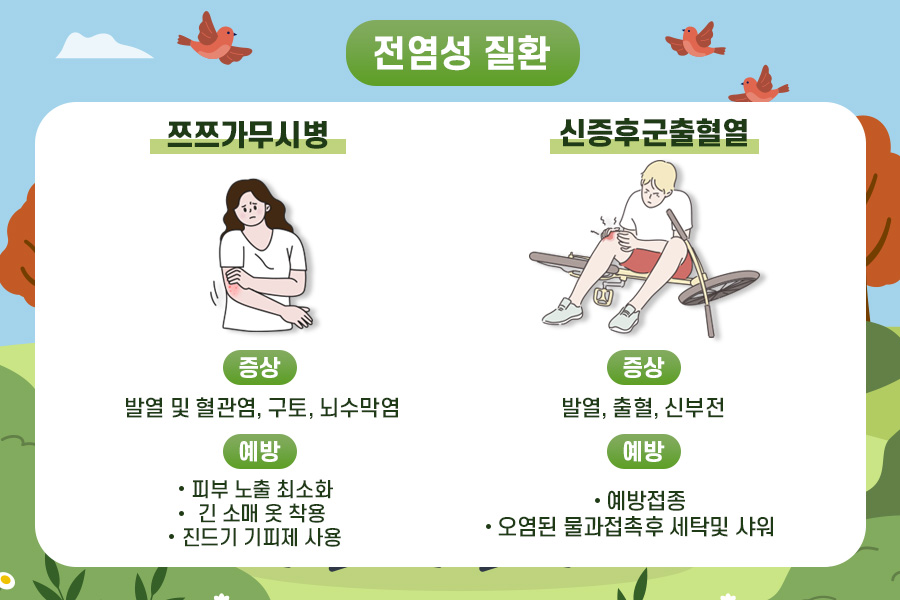 전염성 질환은 세균이나 바이러스에 감염된 진드기나 쥐가 사람에게 바이러스를 옮기면서 발생하는 질병입니다.