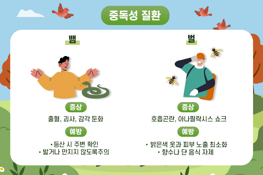 뱀은 가을철에 독성이 많아지고 낮에 활동하는 것이 특징입니다. 뱀에 물렸을 경우 우선 독사인지 확인해야 합니다. 물린 부위에 2개의 이빨 자국이 있거나 피부가 변색되는 등 변화가 있다면 독사일 가능성이 큽니다. 독사에 물려 독이 퍼지면 출혈, 괴사, 감각 둔화 증상이 발생합니다. 독사에 물렸다면 물린 부위 5-10cm 윗부분을 끈이나 수건을 이용해 손가락이 들어갈 여유를 두고 묶은 후 물린 부위를 심장보다 낮은 위치에 있도록 유지하며 응급처치를 하는 것이 중요합니다. 가을철 산이나 풀숲에 가야 하는 경우 막대기로 주변에 뱀이 있나 확인하는 것이 필수입니다. 또한 실수로 뱀을 밟거나 죽은 것처럼 보인다고 함부로 만지는 것을 피해야 합니다.