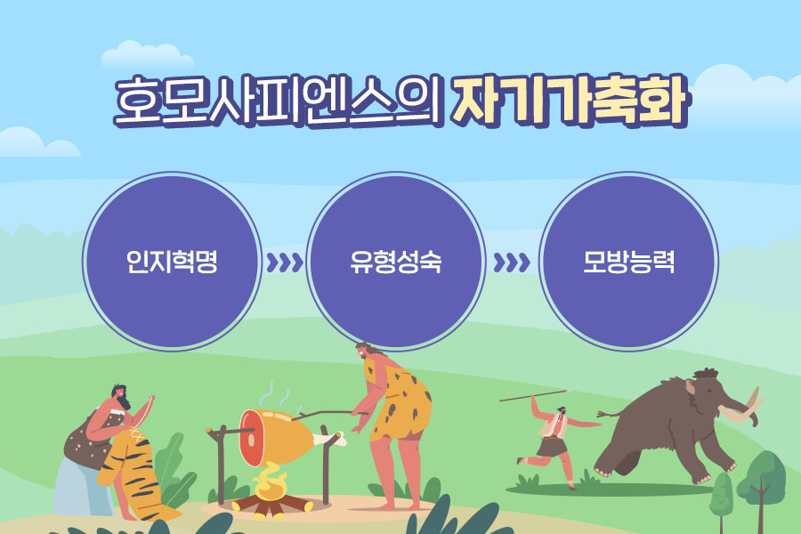 자기가축화를 통해 사회적 학습 능력과 모방 능력을 습득하여 원활한 지식의 전파가 이루어졌기 때문입니다.
