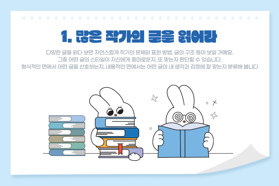 다양한 글을 읽다 보면 자연스럽게 작가의 문체와 표현 방법, 글의 구조 등이 보일 거예요. 그중 어떤 글의 스타일이 자신에게 흥미로운지, 또 맞는지 판단할 수 있습니다. 형식적인 면에서 어떤 글을 선호하는지, 내용적인 면에서는 어떤 글이 내 생각과 감정에 잘 맞는지 분류해 봅니다. 읽기를 할 때는 무조건 저자의 의견을 받아들이지 않아도 됩니다. 비평적인 시각에서 내 생각과 비슷하면 어떤 부분에서 비슷한지, 다르다면 어떤 부분에서 다른지 메모하는 것도 좋습니다.